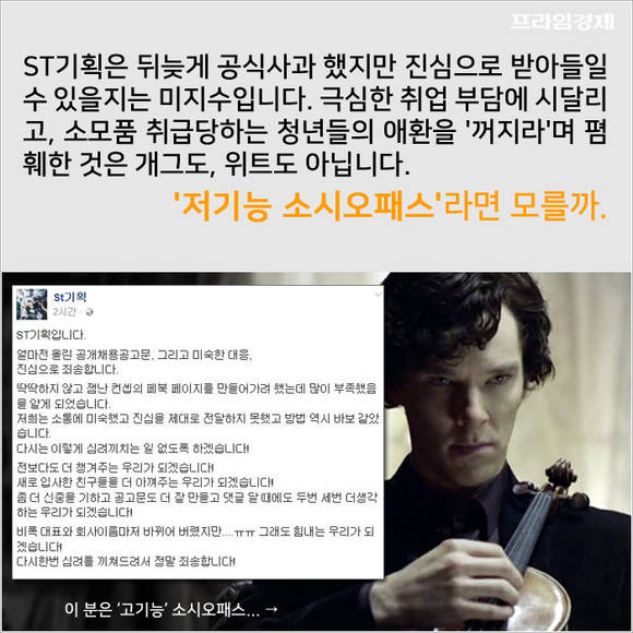 ST기획은 뒤늦게 공식사과 했지만 이를 진심으로 받아들일 수 있을지는 모르겠습니다. 극심한 취업스트레스에 시달리고, 소모품 취급당하는 수많은 청년들의 애환을 '꺼지라'며 폄훼한 것은 개그도, 위트도 아니죠.