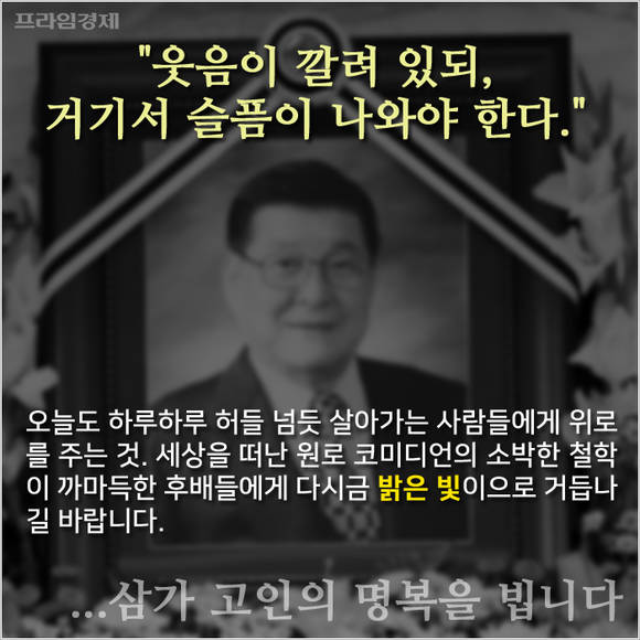 오늘도 하루하루 허들 넘듯 살아가는 사람들에게 위로를 주는 것. 세상을 떠난 원로 코미디언의 소박한 철학이 까마득한 후배들에게 다시금 밝은 빛으로 거듭나길 바랍니다.