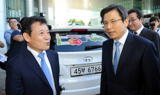 이날 윤장현 광주시장은 황 총리에게 "1호 관용차로 전기차를 이용하고 있다"며 수소차와 전기차의 원리를 상세히 소개했다.