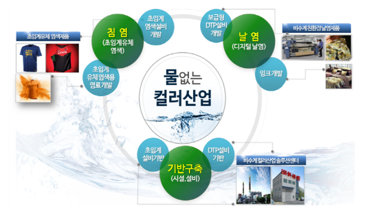 이 사업은 2017년부터 2021년까지 총사업비 550억원을 투입해 △초임계 유체 염색 △디지털 날염 관련 기술개발 사업 △기업지원을 위한 비수계(非水系) 컬러산업 솔루션 센터 구축 △비수계 염색관련 원천기술 개발 △관련 중소기업 연구개발 △환경규제 대응 등을 지원하게 된다.