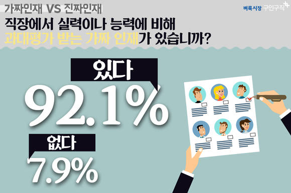[프라임경제] 구인구직정보제공 전문기업 벼룩시장구인구직(대표이사 최인녕)이 최근 직장인 855명을 대상으로 실시한 설문조사 결과 10명 중 9명이 직장 내 과대 포장된 가짜 인재가 있다고 답했다.