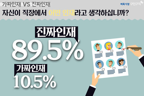 반면 직장인들에게 자신이 어떤 인재인지를 묻는 질문에는 10명 중 9명이 자신이 '진짜 인재'라고 답해 내로남불(내가 하면 로맨스 남이 하면 불륜)이 직장 내 만연한 것으로 파악됐다.