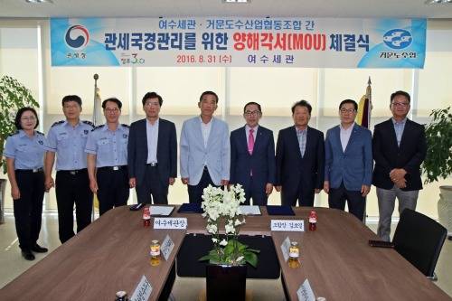 지난 31일 세관 회의실에서 '거문도항'을 통한 양식장 물고기 사료인 냉동까나리 등을 수입하기 위해 외국무역선이 입항하는 곳으로 이곳을 통한 총기류 등 사회안전위해물품 반입차단에 거문도수협의 협력이 필수적임을 인식하고 효율적인 항만감시를 위한 민관 MOU를 체결하게 됐다.