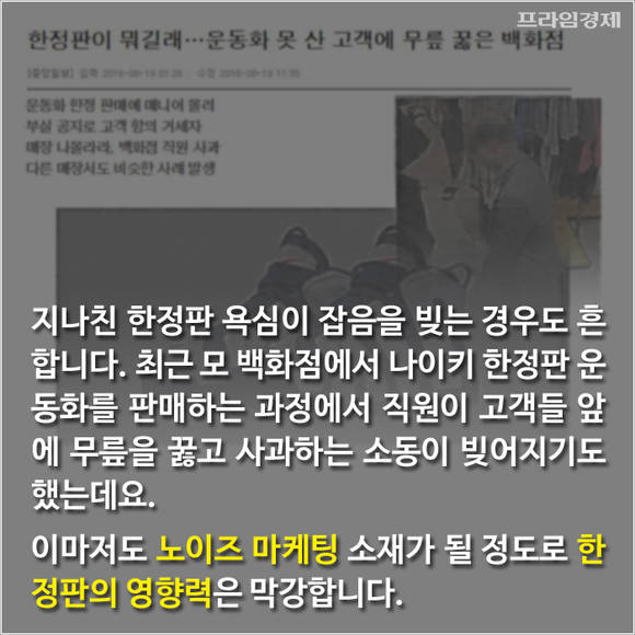 물론 지나친 한정판 열기가 잡음을 빚는 경우도 흔합니다. 최근 롯데백화점 모 지점에서 직원이 고객들 앞에 무릎을 꿇고 사과하는 소동이 빚어졌습니다. 한정판 농구화(나이키 에어모어 업템포)를 사려는 인파가 몰리면서 벌어진 일이었는데요. 이마저도 노이즈 마케팅 소재가 될 정도로 한정판의 영향력은 막강합니다.