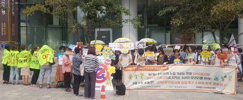 비영리법인 소비자생활협동조합 '아이쿱(iCOOP)생협'은 6일 서울 청계광장에서 참가자 60여명이 모인 가운데 'GMO완전표시제 입법 촉구 소비자 하루 행동'을 진행했다.