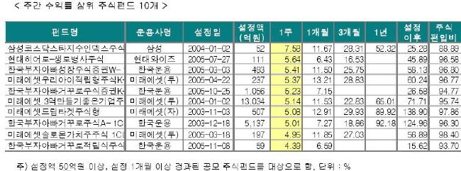한편 1월 첫째주에는 코스닥 시장이 6.5% 급상승함에 따라 이에 대한 투자 비중이 높은 펀드들이 강세를 나타냈다.
