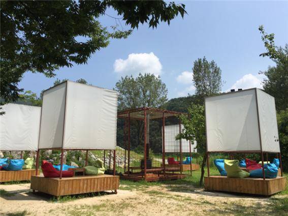 강원도 춘천에 위치한 E카페다. 카페 바로 앞에 위치한 산과 천, 그리고 앞 잔디밭에는 누워서 쉴 수 있는 큼직한 쿠션 의자가 즐비하다. 시원한 음료 한 잔에 선베드 같은 쿠션 위에 누우면 해외 휴양지 부럽지 않다.