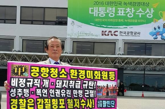 [프라임경제] 시민단체 활빈단(대표 홍정식)은 14일 1인시위를 통해 한국공항공사에 열악한 근무환경과 관리자들의 성추행에 분노해 추석연휴 파업에 들어간 김포공항 비정규직 청소미화원 및 카트노동자들에 대한 처우개선을 강력 요구했다.