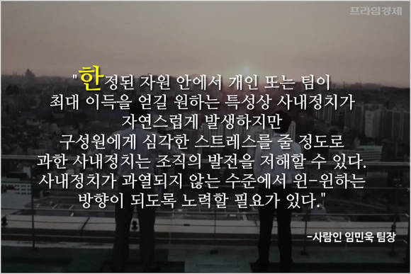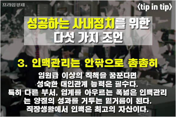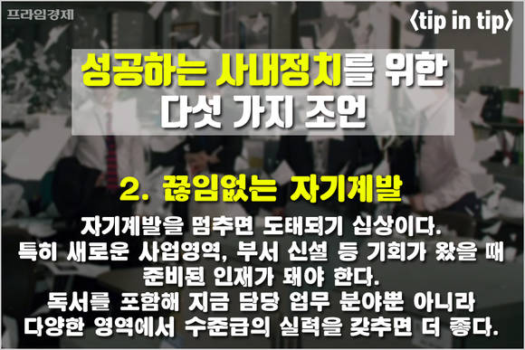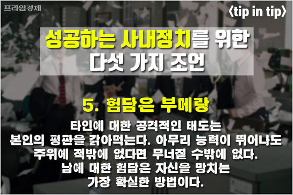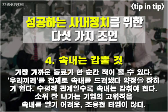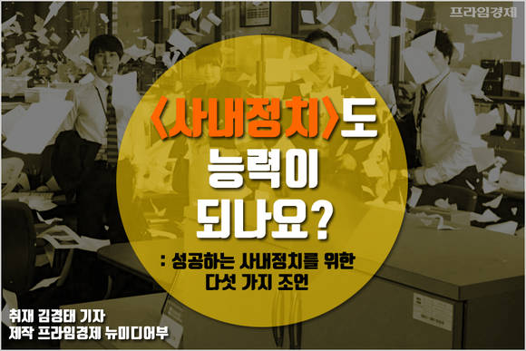 [프라임경제] 어느 회사든 '사내정치'는 직장생활에서 빠질 수 없는 생존 전략으로 꼽힙니다. 표면적으로 사내정치를 인정하는 기업은 없지만 직장인을 대상으로 하는 다양한 조사에서 확고하게 존재감을 자랑하는 회사 내 '비공식 라인'이기 때문입니다.