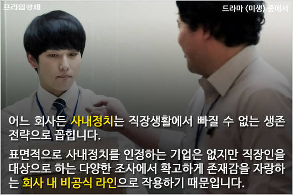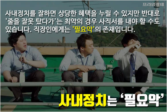 사내정치를 잘 활용하면 연봉협상이나 업무 추진에서 상당한 혜택을 누릴 수 있지만 반대로 '줄을 잘못 탔다가'는 자의 반, 타의 반으로 사직서를 내야 할 수도 있기 때문에 직장인에게는 필요악의 존재입니다.