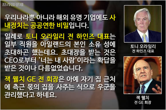 일례로 미국 식품회사 하인즈의 토니 오라일리 전 대표는 신임하는 직원들을 아일랜드에 있는 본인 소유의 성으로 초대하곤 했습니다. 이 초대장을 받는 것은 CEO로부터 '너는 내 사람'이라는 확답을 받은 것이나 다름없었습니다. GE 잭 웰치 전 회장은 아예 자기 집 근처에 측근 몫의 집을 사주는 식으로 우군을 관리했다고 하네요.