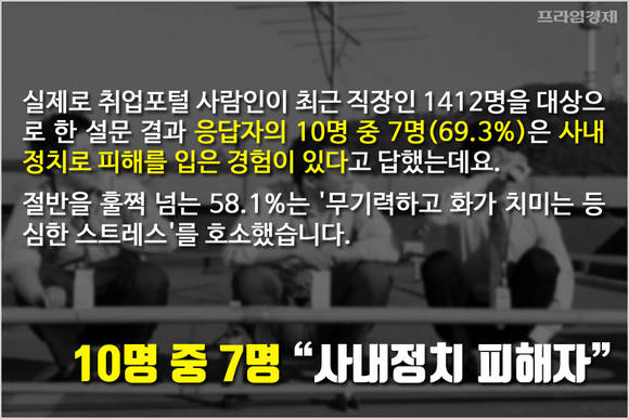 실제로 취업포털 사람인이 최근 직장인 1412명을 대상으로 한 설문 결과 응답자의 10명 중 7명(69.3%)은 사내정치로 피해를 입은 경험이 있다고 답했는데요. 이 중 절반을 훌쩍 넘는 58.1%는 '무기력하고 화가 치미는 등 심한 스트레스'를 호소했습니다.
