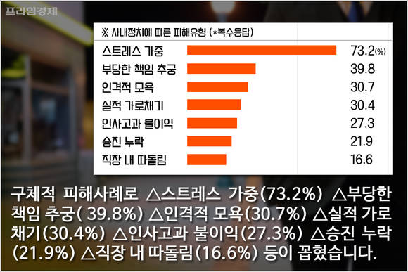 구체적인 피해사례(복수응답)로는 △스트레스 가중(73.2%) △부당한 책임 추궁(39.8%) △인격적 모욕(30.7%) △실적 가로채기(30.4%) △인사고과 불이익(27.3%) △승진 누락(21.9%) △직장 내 따돌림(16.6%) 순이 꼽혔습니다.