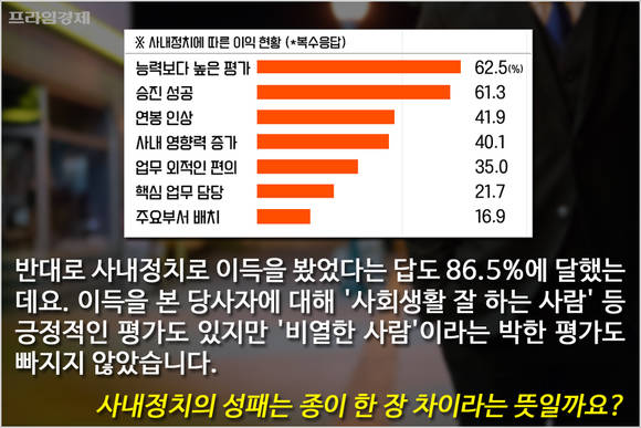 반대로 사내정치 덕분에 이득을 본적이 있다는 답도 86.5%에 달했는데요. △능력보다 더 높은 평가를 받았다(62.5%) △승진 성공(61.3%) △연봉 인상(41.9%) △사내 영향력 증가(40.1%) △업무 외적인 편의 제공(35%) △핵심 업무 담당(21.7%) △핵심부서 배치(16.9%) 등의 이득을 챙겼다는 겁니다.