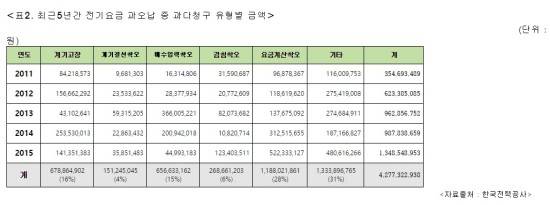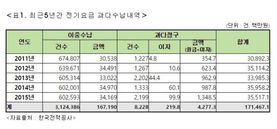 특히 한전의 잘못으로 과다 청구된 금액은 2011년 3억5500만원에서 2015년 13억5000만원으로 최근 5년간 약 4배 증가하는 등 매년 증가하고 있어 대책마련이 시급한 상황이다.