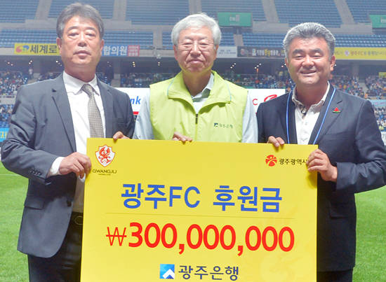 광주은행은 지난 21일 오후 7시 광주월드컵경기장에서 펼쳐진 현대오일뱅크 K리그 클래식 31라운드 수원전에 앞서 JB금융그룹 광주은행(은행장 김한)과 3억원 후원금 전달식을 가졌다.