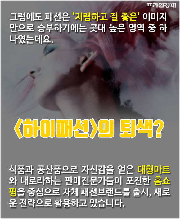 식품과 공산품으로 자신감을 얻은 대형마트와 내로라하는 판매전문가들이 포진한 홈쇼핑업체를 중심으로 자체 패션브랜드를 출시, 국내외 소비자들의 호평을 얻고 있습니다.