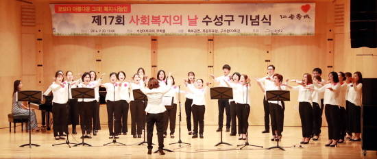 1부 행사에서는 한국장애인소리예술단의 '현악4중주'와 수성다문화가족합창단 해피코러스가 감동의 무대를 선사했다. 이어 사회복지유공자 표창, 구민이 정성스레 모은 후원금으로 모범중고등학생 150명에게 7500만원을 지원하는 사랑의 장학금 전달식, 사회복지사업 윤리선언문 낭독 순으로 행사가 진행됐다.