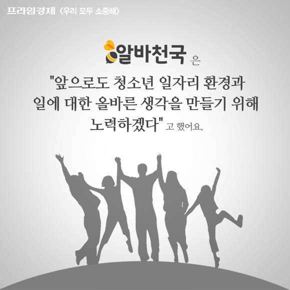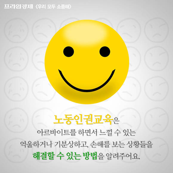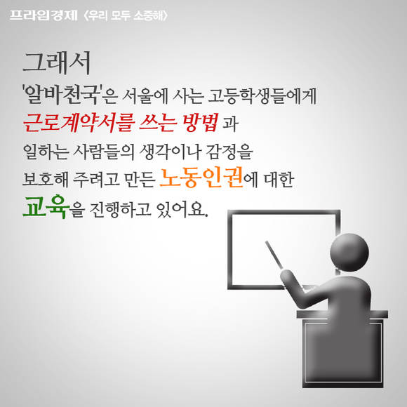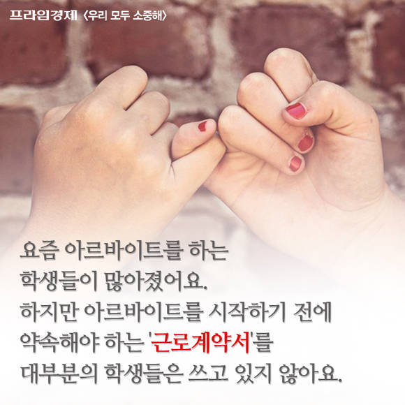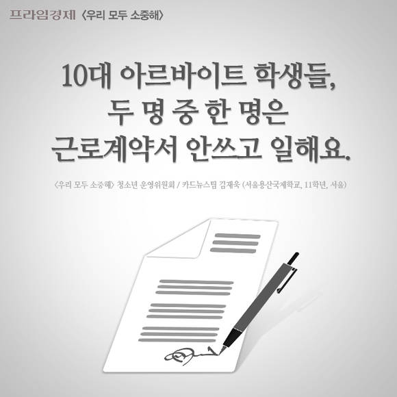 [프라임경제] '우리 모두 소중해' 캠페인의 재능기부 편집위원으로 참여하는 청소년 학생들은 [우리모두뉴스] 기사들을 카드뉴스로도 제작합니다. 이번에는 서울용산국제학교 11학년(고2) 김재욱 학생이 '10대 아르바이트 학생들, 두 명 중 한 명은 근로계약서 안쓰고 일해요' 기사를 카드뉴스로 제작했습니다.