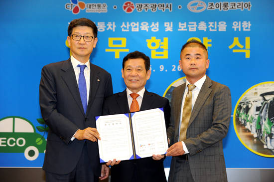 [프라임경제] 광주광역시는 26일 오전 시청 3층 비즈니스룸에서 CJ대한통운(대표이사 박근태), 조이롱코리아(대표 김태혁)와 '전기자동차 산업 육성 및 보급 촉진을 위한 업무협약'을 체결했다.