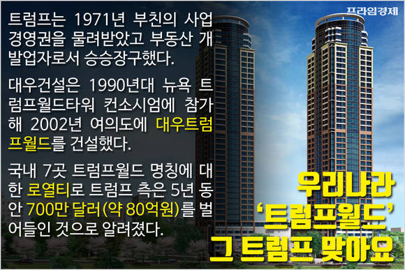 1990년대 뉴욕 트럼프월드타워 컨소시엄에 참가했던 대우건설과 손잡고 2002년 서울 여의도에 41층 높이의 대우트럼프월드를 건설하기도 했는데요. 그는 국내 7곳의 트럼프월드 로열티로 5년 동안 700만달러(약 80억원)을 챙기기도 했습니다.
