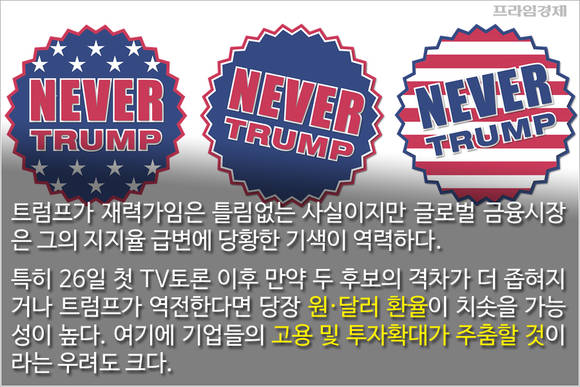국내에서는 트럼프가 힐러리를 앞설 경우 투자심리가 훼손되고 실물경제에도 부정적인 영향을 미칠 것이라는 분석이 우세합니다. 오는 26일(현지시간) 치러질 첫 TV토론 이후 두 후보의 격차가 더 좁혀지거나 트럼프가 역전한다면 위험회피 심리를 자극해 원·달러 환율이 치솟을 가능성을 배제할 수 없습니다.