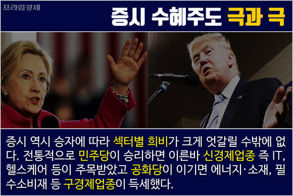 동시에 두 후보의 정책과 정당 성향에 따라 수혜주를 가리려는 움직임도 분주합니다. 과거 민주당이 승리했을 때는 신경제업종에 속하는 IT, 헬스케어가 선전했고 반대로 공화당이 승리하면 에너지·소재, 필수소비재 등 구경제 업종이 상대적으로 득세했습니다.