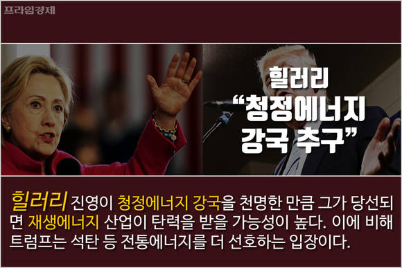 힐러리는 지구 온난화 방지와 청정에너지 강국을 역설하고 있어 재생에너지 산업이 탄력을 받을 가능성이 높습니다. 이에 비해 트럼프는 석탄 등 전통에너지를 더 선호하는 입장입니다.