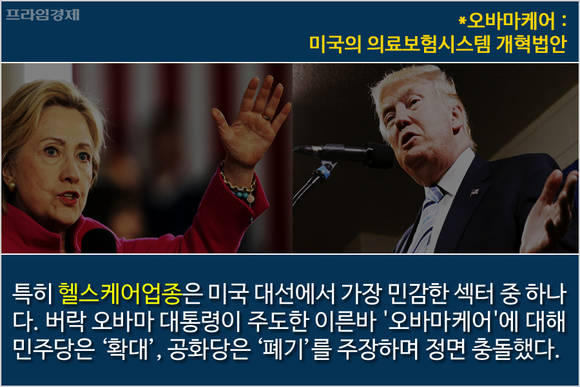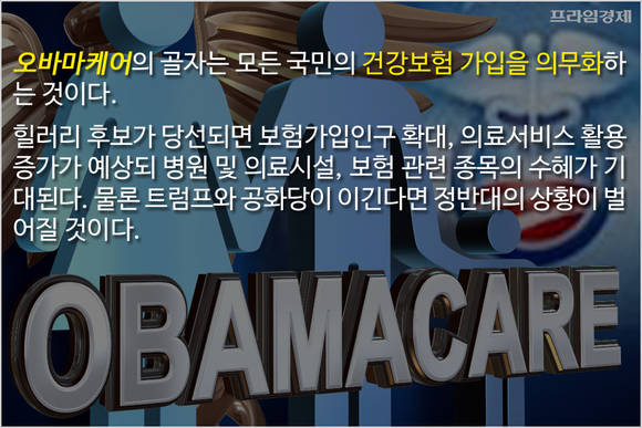 오바마케어는 모든 국민의 건강보험 가입을 의무화하는 내용을 골자로 하며 힐러리가 승리할 경우 보험가입인구 확대와 의료서비스 활용 증가에 따른 병원 및 의료시설, 보험 관련 종목의 수혜가 기대됩니다. 물론 트럼프가 승리한다면 해당 업종은 찬밥 신세가 되겠지만요.