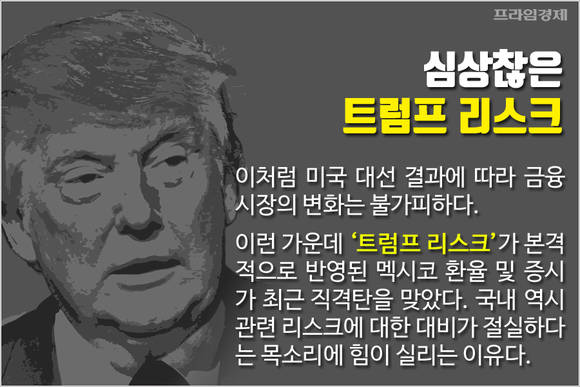 이처럼 미국 대선 결과에 따라 글로벌 금융시장의 변화는 불가피해 보입니다. 최근에는 트럼프 리스크가 본격적으로 반영되면서 멕시코 환율 및 증시가 악재를 맞기도 했는데요. 우리나라 역시 트럼프 리스크에 대비할 필요가 있는 목소리가 커지는 이유입니다.