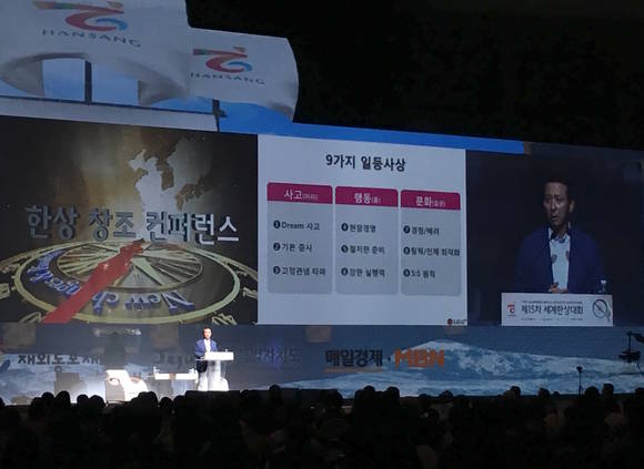 이러한 일등신화를 만든 원동력으로 '9가지 일등 사상'에 대한 강연을 본인의 경험과 사례를 바탕 삼아 한상들에게 전달하며 "어려움은 배워야 할 게 있기에 오는 것"이라는 메시지를 전달했다.