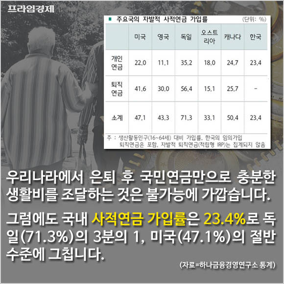 우리나라에서 은퇴 후 국민연금만으로 충분한 생활비를 조달하는 것은 불가능에 가깝습니다. 그럼에도 국내 사적연금 가입률은 23.4%로 독일(71.3%)의 3분의 1, 미국(47.1%)의 절반 수준에 그칩니다.