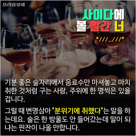 [프라임경제] 모두 어울린 술자리에서 음료수만 마셔놓고 마치 취한 것처럼 행동하는 사람이 주위에 한 명씩은 있을 겁니다. 그럴 때 변명삼아 "분위기에 취했다"고 하는데요. 술은 한 방울도 안 들어갔는데 말이 되냐는 핀잔이 나올 만합니다.