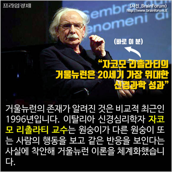 거울뉴런의 존재가 알려진 것은 비교적 최근인 1996년입니다. 이탈리아 신경심리학자인 자코모 리촐라티 교수는 원숭이가 다른 원숭이 또는 사람의 행동을 보고 같은 반응을 보인다는 사실에 착안해 거울뉴런 이론을 체계화했습니다.
