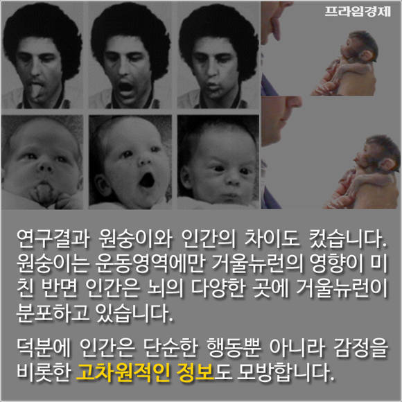 원숭이와 인간의 차이도 드러났는데요. 원숭이의 거울뉴런은 운동 영역에만 영향을 미치는 것에 비해 인간은 뇌의 다양한 곳에 거울뉴런이 분포하고 있습니다. 덕분에 인간은 단순한 행동뿐 아니라 감정을 비롯한 고차원적인 정보까지 모방합니다.