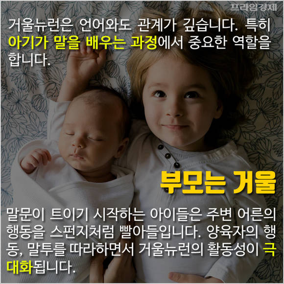 거울뉴런은 언어와도 관계가 깊고 특히 아기가 말을 배우는 과정에서 중요합니다. 말문이 트이기 시작하는 아이들은 주변 어른의 행동을 스펀지처럼 빨아들이는데요. 양육자의 행동과 말투를 따라하는 과정에서 거울뉴런의 활동성이 극대화됩니다.