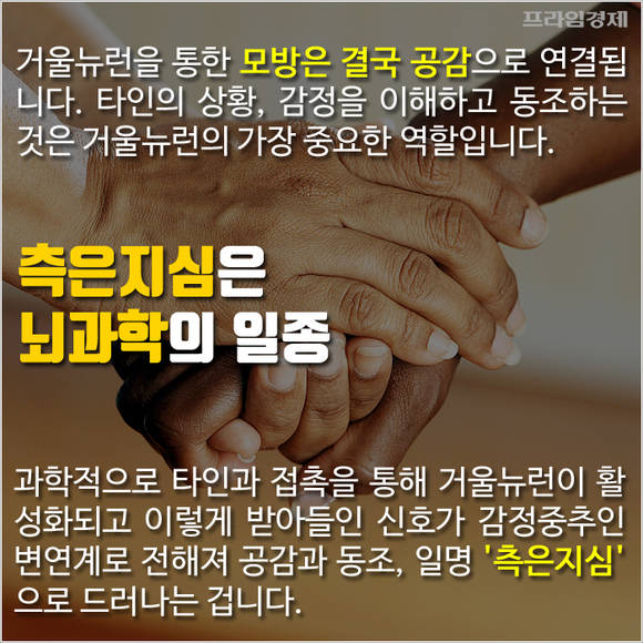 궁극적으로 거울뉴런을 통한 모방은 공감으로 연결됩니다. 다른 사람의 상황이나 감정을 이해하고 공감하는 것은 거울뉴런의 가장 중요한 역할입니다. 과학적으로 타인과의 접촉을 통해 거울뉴런이 활성화되고 이렇게 받아들인 신호는 감정중추인 변연계로 전해져 감정에 대한 공감과 동조, 일명 '측은지심'으로 드러나는 겁니다.