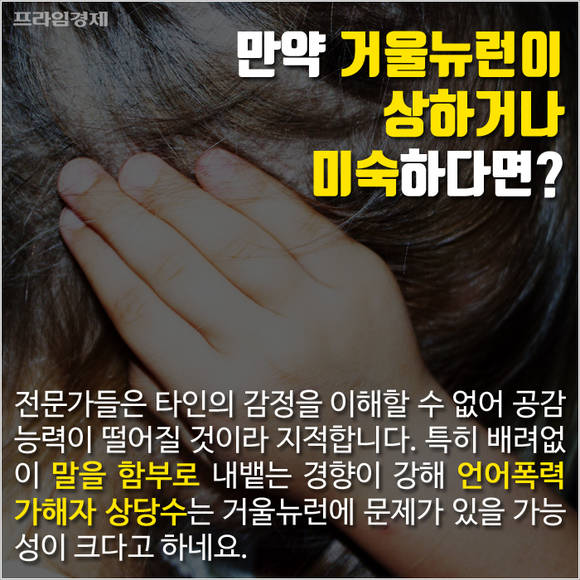 최근 일상화된 언어폭력 및 타인에 대한 배려 부족은 사회 구성원 상당수가 인간 뇌구조의 기본인 거울뉴런에 심각한 문제가 생겼음을 증명한 것으로 볼 수 있습니다. 단순히 '분위기에 취했다'에 그칠 게 아니라 성숙한 사회생활을 위해 거울뉴런의 존재를 상기할 때입니다.