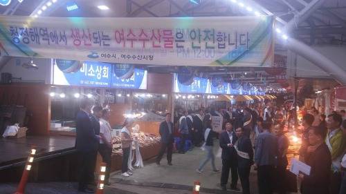 [프라임경제] 여수시(시장 주철현)는 29일 오후 여수수산시장에서 '청정해역에서 생산되는 여수수산물은 안전합니다'라는 주제로 여수지역 기관단체장을 비롯해 지역주민과 시장상인 등 약 200여명이 참여 해 최근 콜레라 등으로 인해 위축된 수산물 시장경기를 다시 활성화하고 지역 수산물의 안전성을 홍보하기 위해 시식회를 가졌다.
