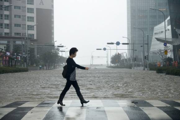 [프라임경제] 지난 5일 제18호 태풍 '차바'가 해운대 마린시티를 강타한 가운데 한 시민이 이를 아랑곳하지 않은 채 횡당보도를 유유히 건너고 있다.