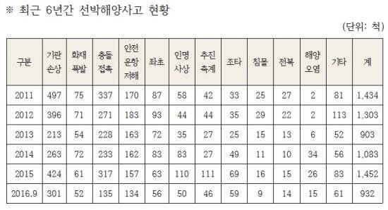 사고유형별로 보면 작년 기준 △기관손상 424건(29.2%) △충돌·접촉 317건(21.83%) △안전운항저해 157건(10.8%) 순이었다.