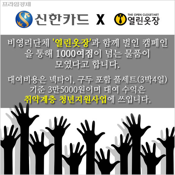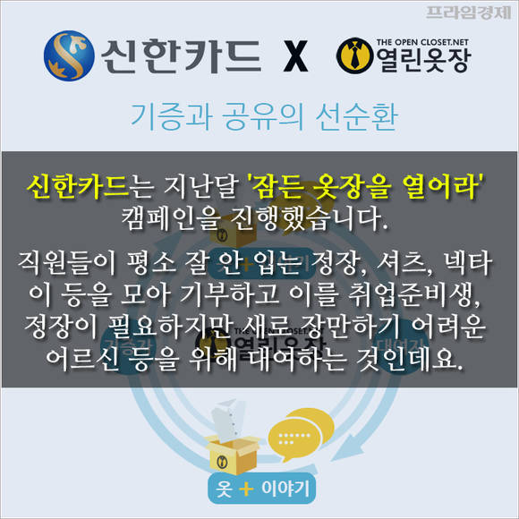 신한카드는 지난달 '잠든 옷장을 열어라' 캠페인을 진행했습니다. 임직원들이 평소 잘 안 입는 정장, 셔츠, 넥타이 등을 모아 기부하면 이를 취업준비생이나 정장이 필요하지만 새로 장만하기 어려운 어르신에게 싼 값에 대여하는 것인데요.