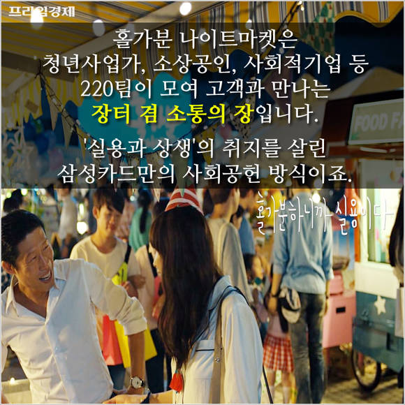 홀가분 나이트마켓은 청년사업가, 소상공인, 사회적기업 등 220팀이 모여 다양한 상품과 서비스를 홍보하고 고객과 만나는 장터입니다. '실용과 상생'의 취지를 살린 삼성카드만의 사회공헌 방식이죠.