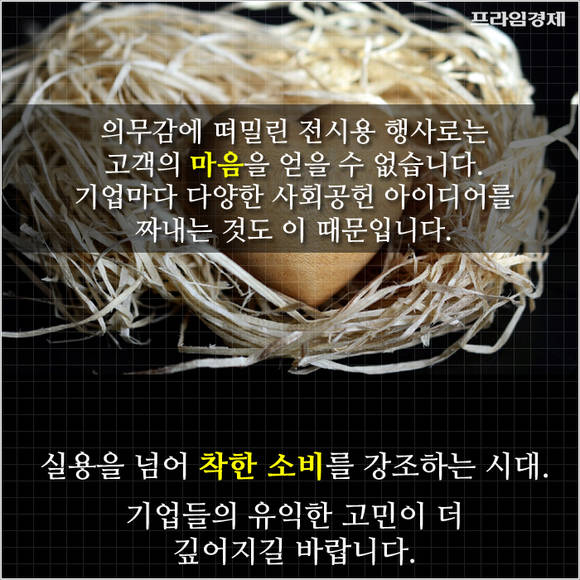 의무감에 떠밀린 전시용 행사만으로는 고객의 마음을 얻을 수 없습니다. 기업마다 다양한 사회공헌 아이디어를 짜내는 것도 이 때문일 텐데요. 실용을 넘어 착한소비를 강조하는 시대에 기업들의 유익한 고민이 더 깊어지길 바랍니다.