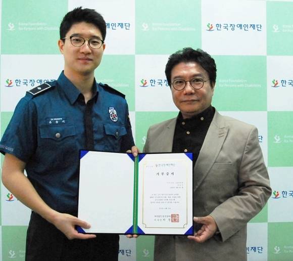주인공은 서울성북경찰서 공관경비대에서 복무 중인 유승기 수경으로 제대를 앞두고 마지막 휴가를 나온 10일 오후 한국장애인재단을 찾아 장애인을 위해 사용해달라며 기부금을 전했다.