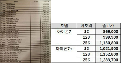 게시된 이미지에 따르면 아이폰7은 △32G 86만9000원 △128G 99만9900원 △256G 113만800원으로 책정됐으며 아이폰7플러스는 △32G 102만1900원 △128G 115만2800원 △256G 128만3700원이다.