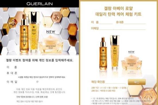 겔랑은 지난 10일부터 신제품 '겔랑 아베이 로얄 데일리 탄력 케어 3종 체험키트 이벤트'를 진행했다. 이름과 이메일, 전화번호를 적으면 아베이 로얄 페이스오일과 데일리 리페어 세럼, 크림을 각각 1㎖씩 증정하는 이벤트다.