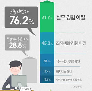 취업에 도움된 부분으로는 절반 이상인 61.7%가 '실무 경험 어필'을 꼽았다. 이어 △조직생활 경험 어필 45.2% △직무 적성 부합 확인 38.1% △비즈니스 매너 17.4% △사수·선배 등 인맥 도움 받음 13.5% 등이 있었다.