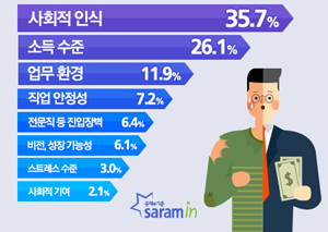 이를 나누는 기준은 '사회적 인식'이 35.7%로 1위를 차지했다. 이어 △소득 수준 26.1% △업무환경 11.9% △직업 안정성 7.2% △전문직 등 진입장벽 6.4% △비전·성장 가능성 6.1% △스트레스 수준 3% △사회적 기여 2.1% 등의 순이었다.