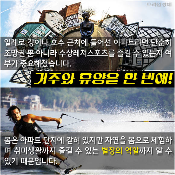 일례로 강이나 호수 근처에 들어선 아파트라면 단순히 조망권뿐 아니라 수상레저스포츠를 즐길 수 있는지 여부가 중요해졌다. 몸은 아파트 단지에 갇혔지만 자연을 몸으로 체험하며 취미생활까지 즐길 수 있는 별장의 역할까지 할 수 있기 때문.